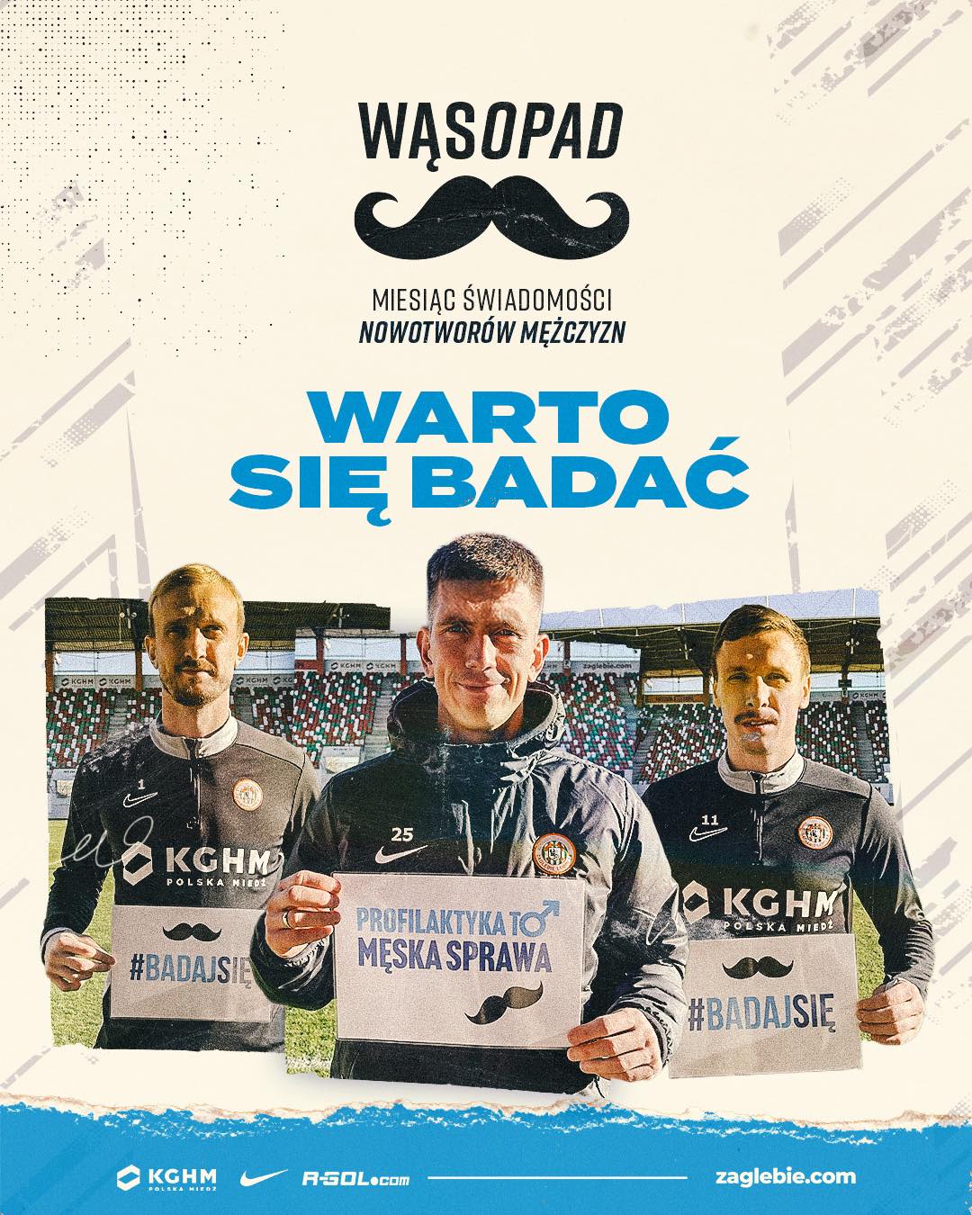 Listopad jest miesiącem, w którym szczególną uwagę zwraca się na profilaktykę oraz leczenie nowotworów u mężczyzn. Stąd ogólnopolska akcja zyskała nazwę "Movember" (bądź w języku polskim: "Wąsopad"), a działania podejmowane w jej ramach koncentrują się na zachęcaniu Panów do udziału w badaniach poprzez osoby i instytucje powszechnie znane. W tym roku po raz kolejny udział w niej bierze również Zagłębie Lubin S.A.